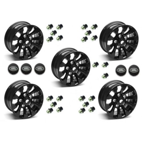 Set van 5 Saw Tooth Style 16x7 lichtmetalen velg - Zwart, inclusief zwarte wielmoeren en 5 center caps met Land Rover logo.